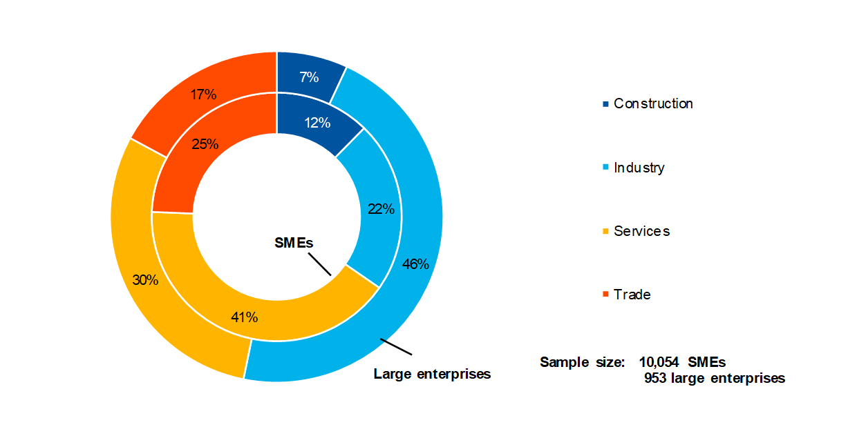 Large companies reported easier access to finance than SMEs. Around 42% of large firms applied for a bank loan, with a higher success rate than SMEs (83%) and a lower rejection rate (1%). According to the survey results, the average interest rate charged to large enterprises on credit lines was around 112 basis points lower than that paid by SMEs, with the spread widening slightly compared with the previous round.