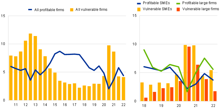 5. Vulnerable firms are defined as firms that simultaneously report lower turnover, decreasing profits, higher interest expenses and a higher or unchanged debt-to-assets ratio, while profitable firms are those that simultaneously report higher turnover and profits, lower or no interest expenses and a lower or no debt-to-assets ratio. The third (and typically largest) group consists of firms that satisfy some, but not all, conditions of the vulnerable and profitable categories. See the box entitled “Distressed and profitable firms: two new indicators on the financial position of enterprises”, Survey on the Access to Finance of Enterprises in the euro area, October 2017 to March 2018, ECB.