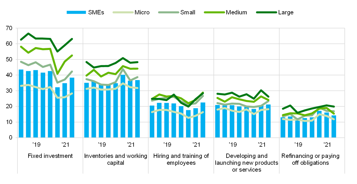 Firms’ investment and hiring decisions have also benefited from the recovery in economic activity. A net percentage of SMEs reported increases in fixed investment (11%, up from -1%), inventories and working capital (5%, up from -9%) and the number of employees (7%, up from -6%), with similar dynamics seen for firms of all sizes, although large firms seemed to experience a faster recovery and micro SMEs a much slower one.