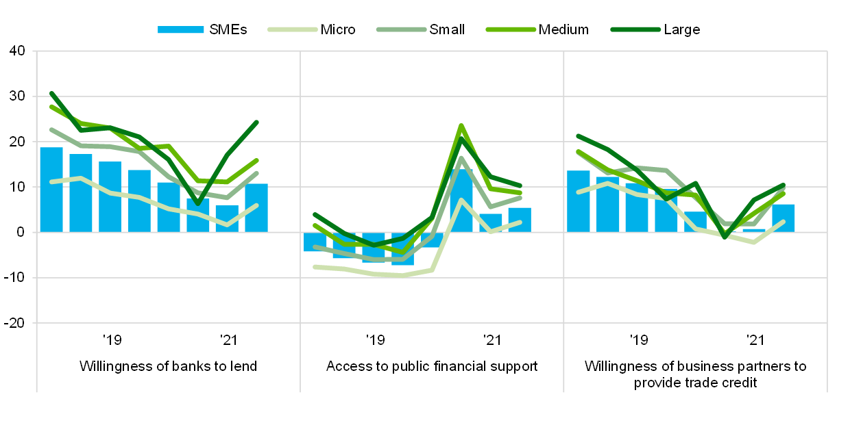 Base: All SMEs; for the category “willingness of banks to lend”, SMEs for which at least one bank financing instrument (credit line, bank overdraft, credit card overdraft, bank loan or subsidised bank loan) is relevant. The figures refer to rounds 18-25 of the survey (October 2017-March 2018 to April 2021-September 2021).