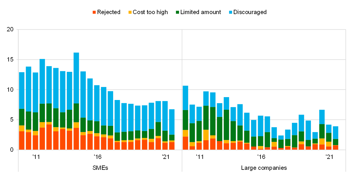 Base: SMEs for which bank loans (including subsidised bank loans) are relevant. The figures refer to rounds 18-25 of the survey (October 2017-March 2018 to April 2021-September 2021).
