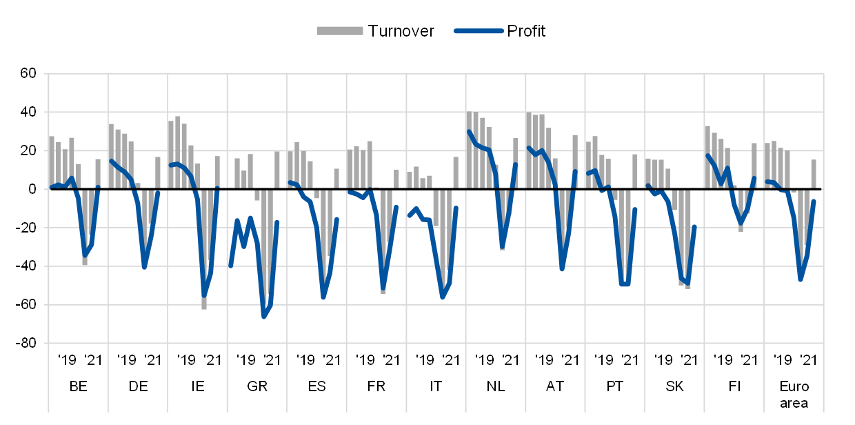 Reflecting the rebound in economic activity, SMEs signalled an increase in turnover (15% in net terms,[2] compared with -29% in the previous survey round). At the same time, SMEs continued to signal declining profits in most countries and sectors, although there was a significant improvement on the previous survey round (-6%, compared with -35%).