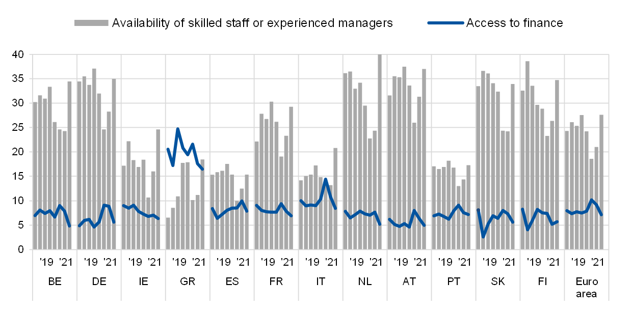 The availability of skilled labour and the difficulty of finding customers continue to be the main concerns for euro area SMEs (see Chart 7). Over the past six months, concerns about the availability of skilled labour have risen again (signalled by a net 28% of SMEs, up from 21%). The difficulty of finding customers remains the second most important concern among SMEs, but declined slightly to 18% (down from 20%). Concerns regarding production costs (13%, up from 12%), regulation (11%, down from 12%) and competition (9%, down from 10%) are mentioned by fewer firms. Finally, SMEs reported marginally fewer concerns regarding access to finance (7%, down from 9%), broadly in line with pre-pandemic percentages.