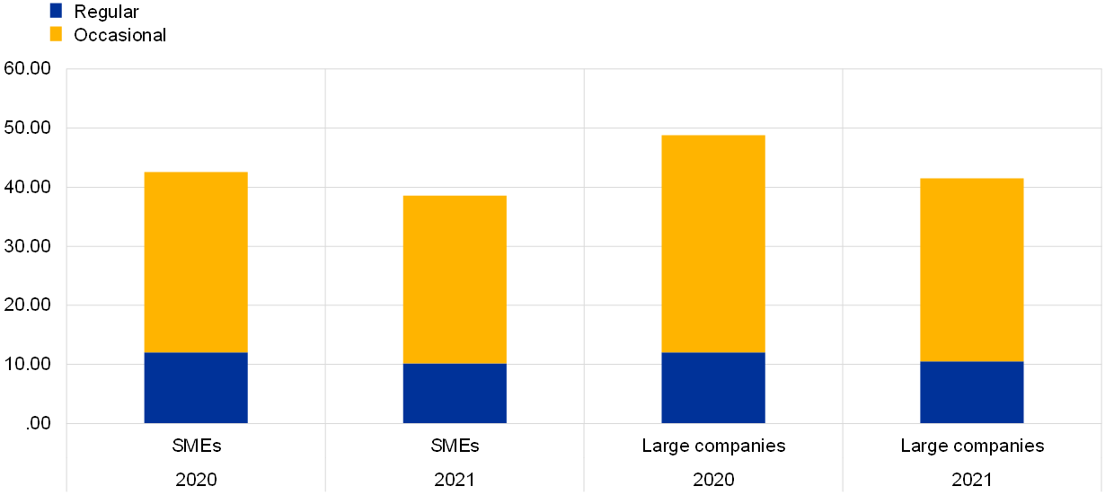 In the survey, euro area enterprises were also asked about the extent to which they perceived late payments[7] as a problem, and what impact these had had on their business activity. In this survey round, 10% of SMEs signalled that in the last six months they had experienced problems on a regular basis, and 28% that they had experienced problems occasionally as a result of late payments from private and/or public entities. These numbers imply just a marginal decrease compared with the responses given in the survey conducted in 2020 (down from 12% and 31% respectively), a pattern that was also reported by large companies (a decrease to 11% and 31% respectively), which suggests that payments to companies have also recovered from the adverse effects of the COVID-19 pandemic.