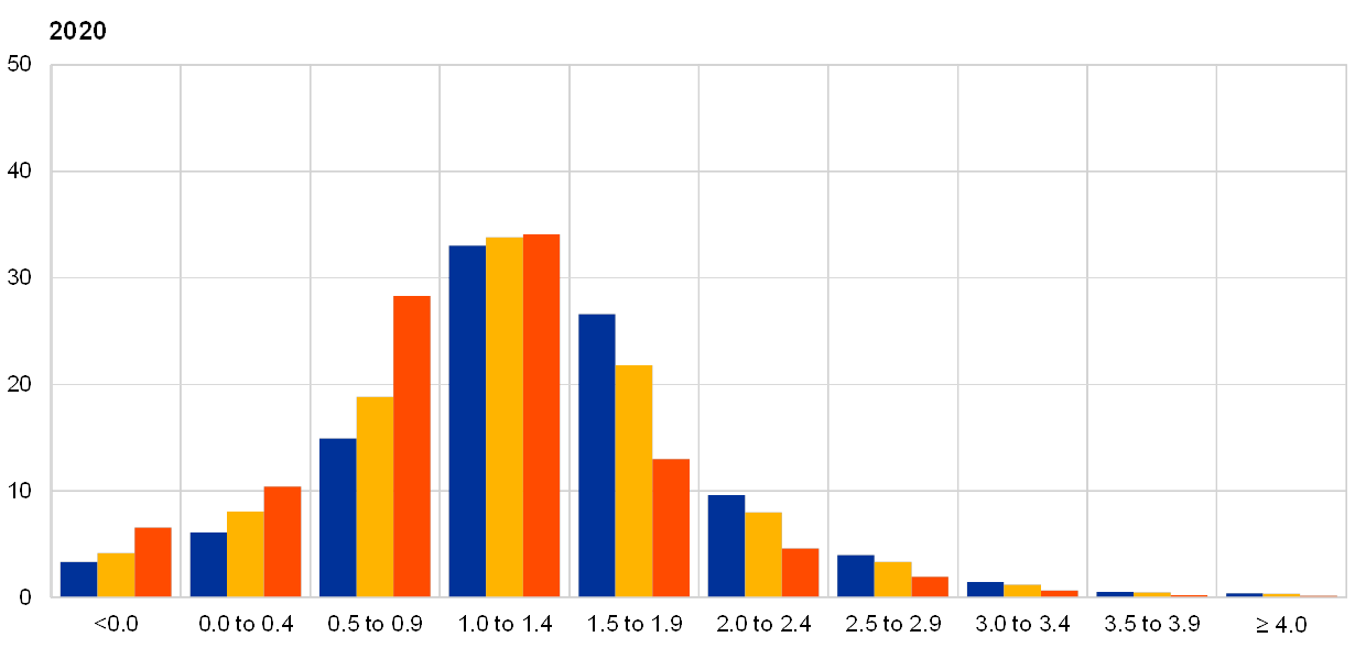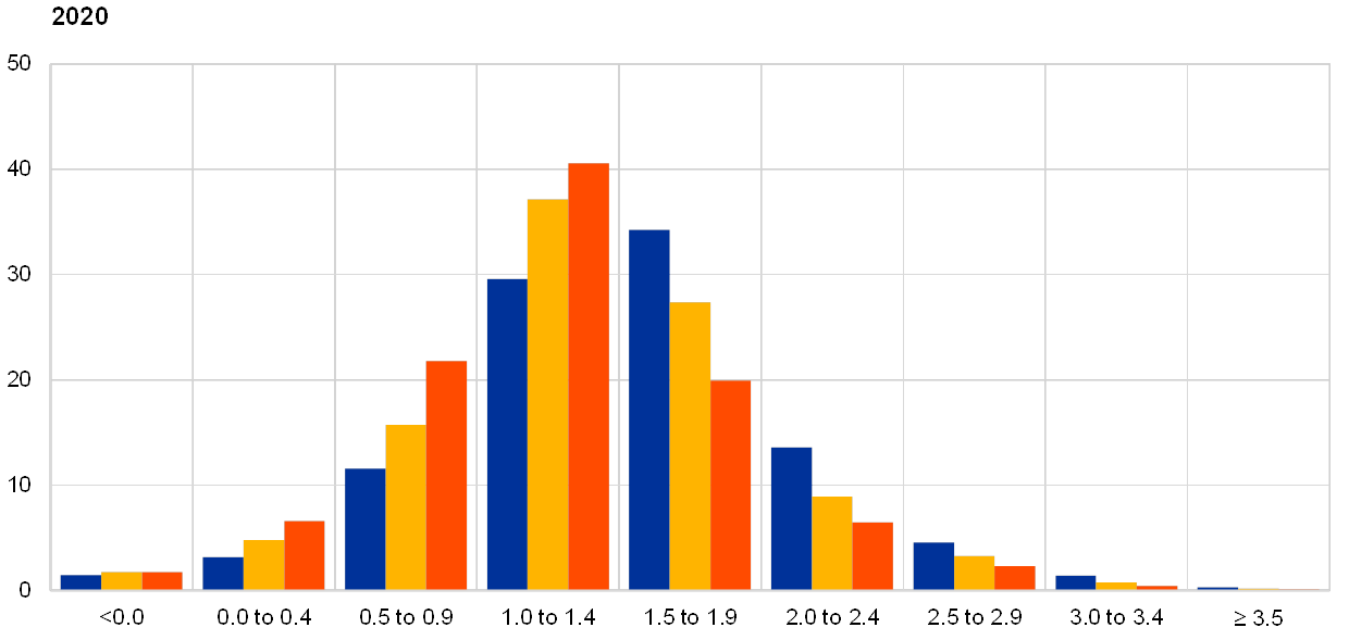 The mean expectation for the rate on the ECB’s main refinancing operations was for it to remain around 0% in the near term and to increase marginally to 0.04% in 2021. This implies that the aggregate expectation for the near-term, quarterly profile remains unchanged, while the expected policy rate for 2021 is revised down slightly from the previous round (see panel (a) of Chart 12).
