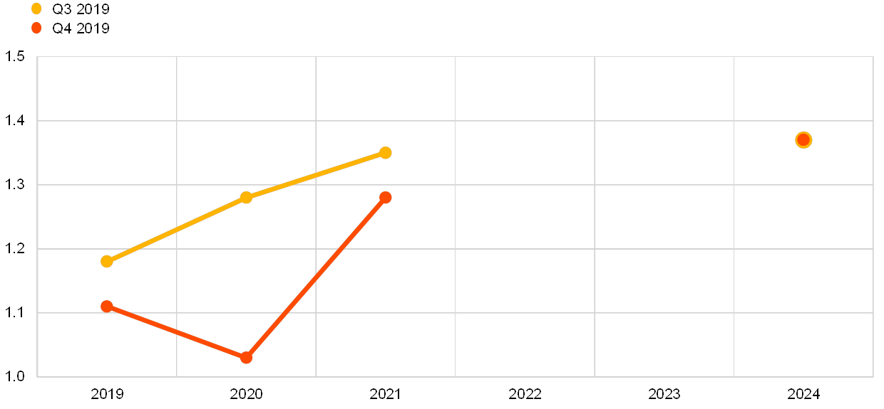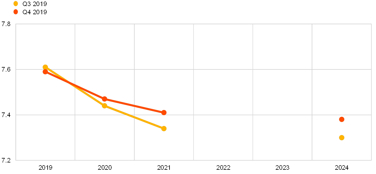The latest ECB Survey of Professional Forecasters (SPF) implies a more pessimistic outlook for inflation, growth and unemployment. The results for the fourth quarter of 2019 show HICP inflation expectations of 1.2% for 2019 and 2020 and 1.4% for 2021.[1] This represents a further downward revision of 0.1 percentage points on average for each horizon relative to the previous survey. Longer-term inflation expectations remained at 1.7%. Real GDP growth expectations were also revised down, notably for 2020, and now stand at 1.1%, 1.0%, and 1.3% for 2019, 2020 and 2021, respectively. However, they remained unchanged at 1.4% for the longer term. Unemployment rate expectations were revised upwards for horizons from 2020 and ahead, and point to a longer-term rate of 7.4%.