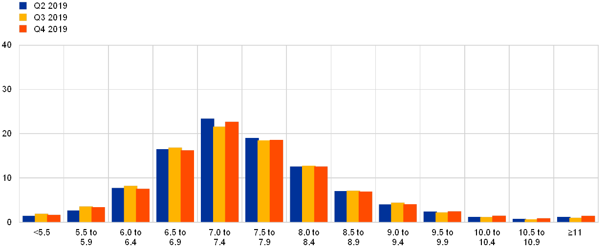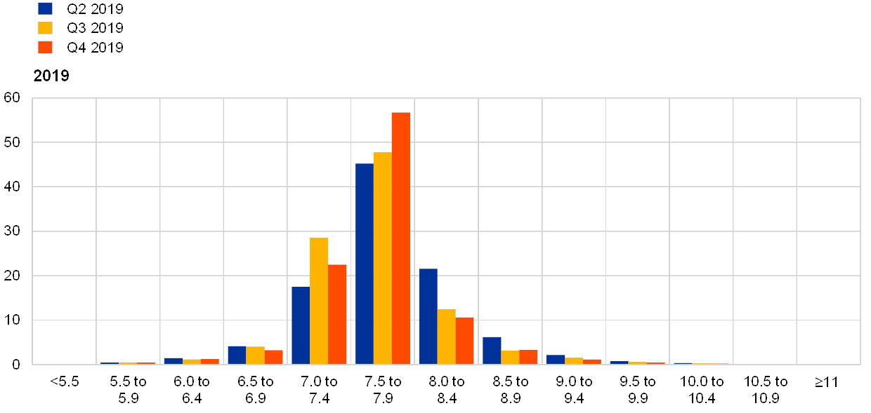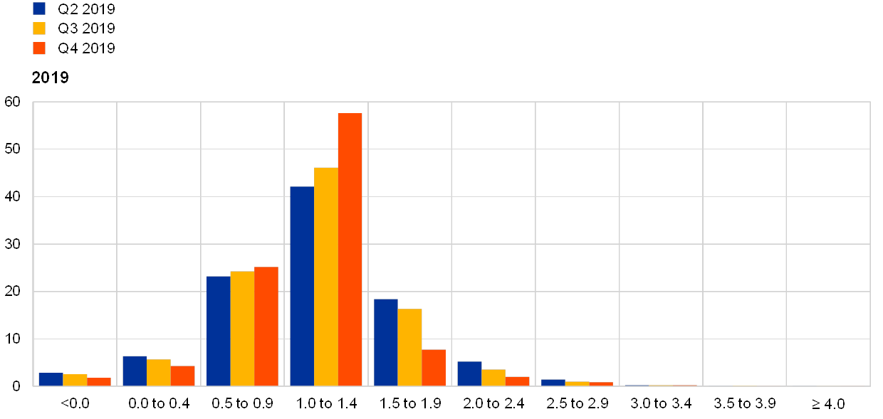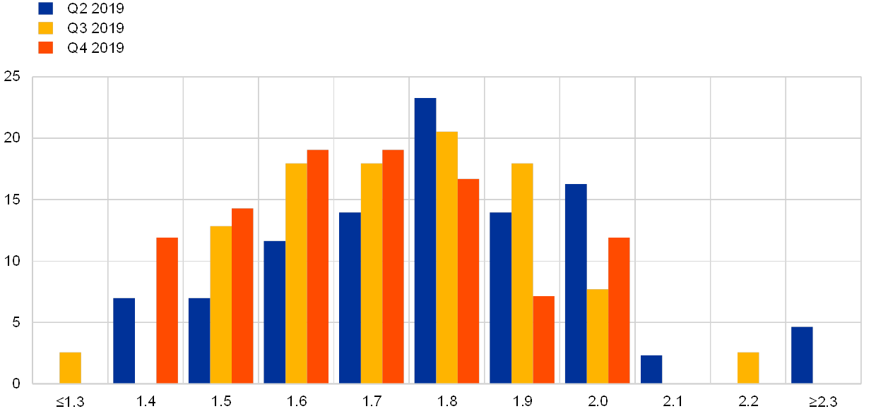 In line with the downward revisions to point forecasts, the aggregate probability distributions also shifted towards lower values. Nonetheless, at all horizons, respondents continued to assign the highest likelihood to outcomes between 1.0% and 1.4%. However, for 2020 and 2021 there was a noticeable increase in the probabilities associated with outcomes between 0.4% and 0.9% (see Chart 7). There was no substantive change in the longer term distribution (see Chart 8).