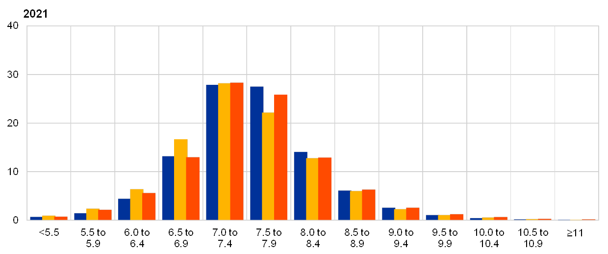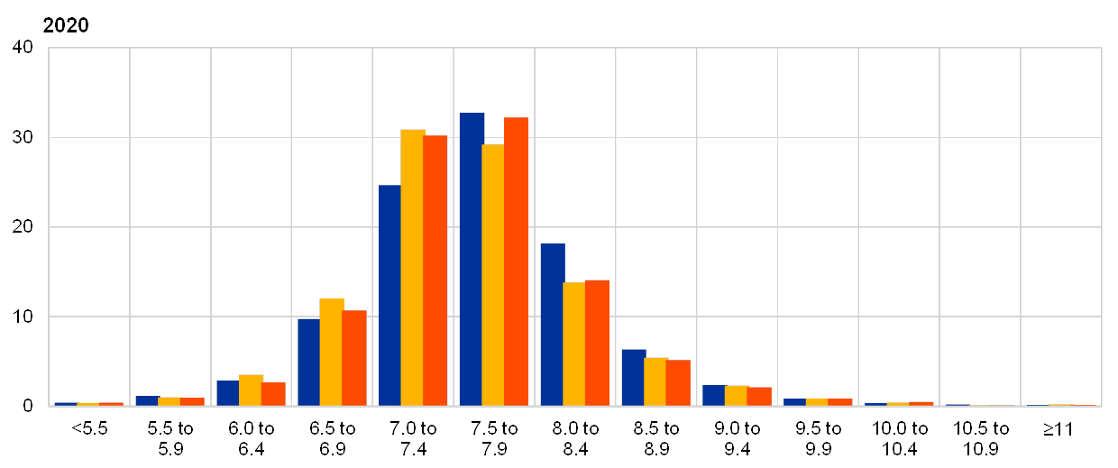 (x-axis: HICP longer-term inflation expectations, annual percentage changes; y-axis: percentages of respondents)