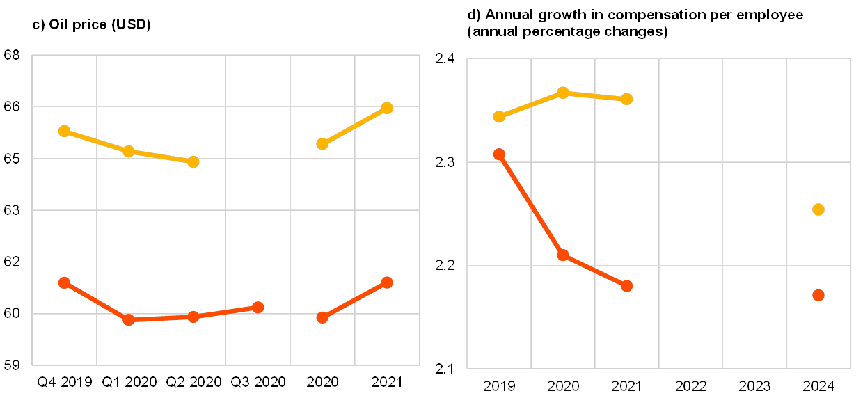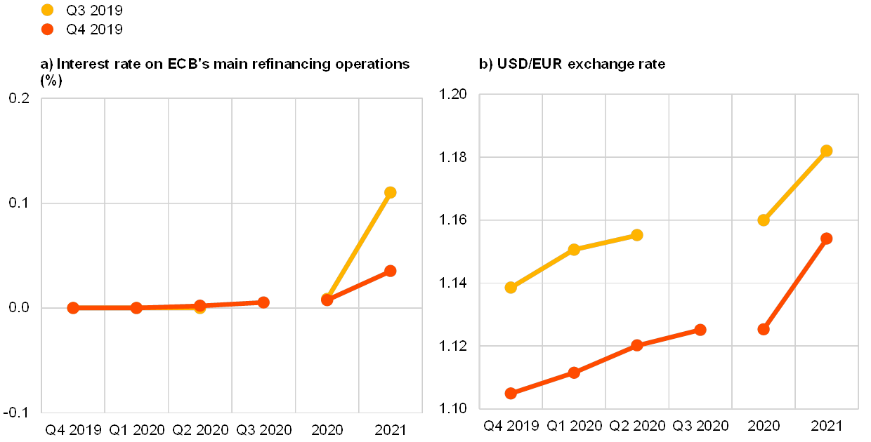 US dollar-denominated oil prices (per barrel) were expected to remain broadly stable at around USD 60 over the period 2020-21. This implies that forecasters now expect prices to be between 6.7% and 7.8% lower at all horizons than they had expected in the previous survey (see panel (c) of Chart 12). When combined with expectations of a slight weakening – around 3% – in the USD/EUR exchange rate, these results imply a profile for the oil price in euro that is around 4.5% lower than in the previous survey.