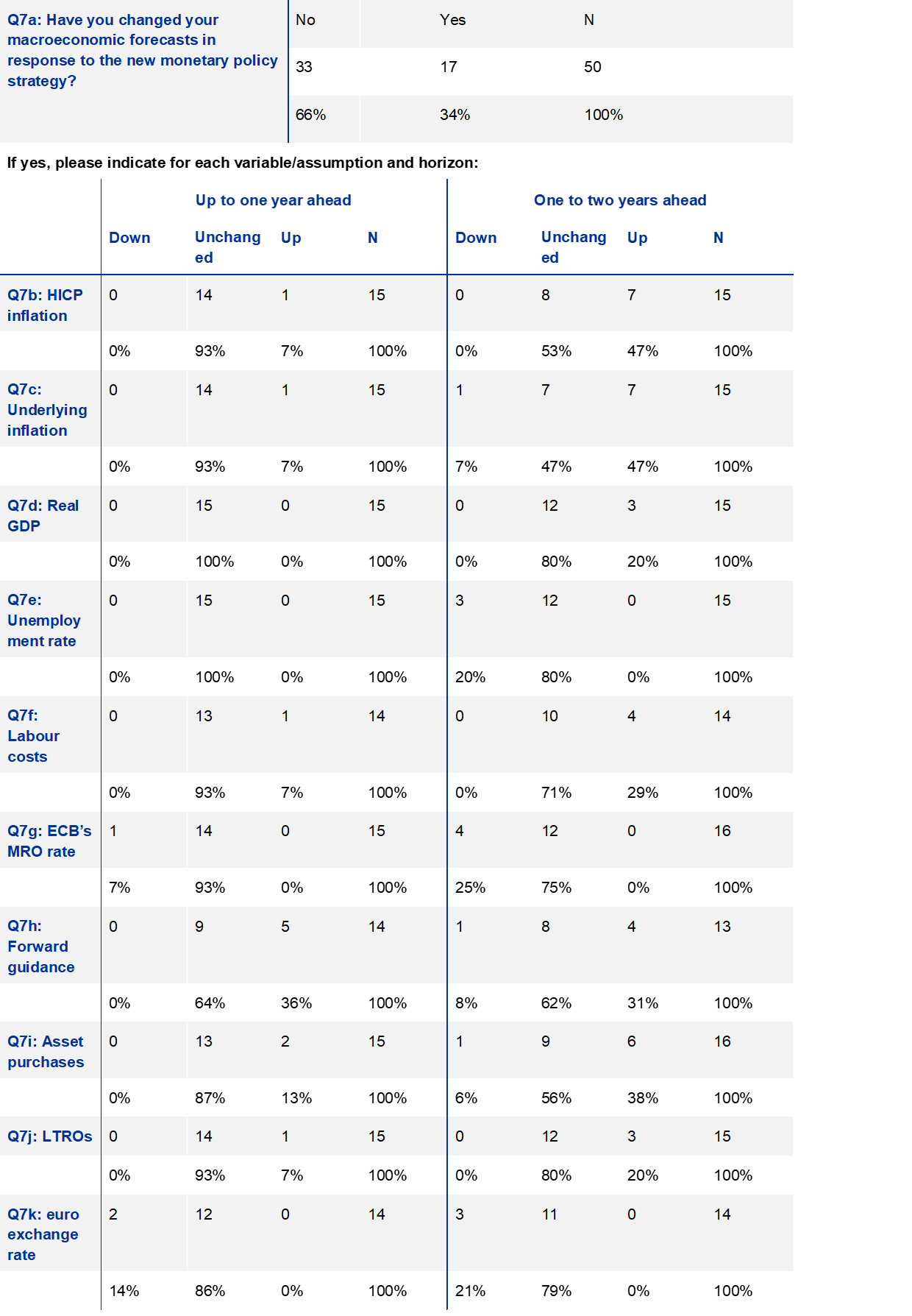 Note: For Question 7h (forward guidance) the possible answers are “shorter” (represented by “down”), “unchanged” and “longer” (represented by “up”); for Question 7k “down” represents depreciation and “up” appreciation.